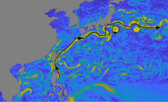 北太平洋環(huán)流的主要結(jié)構(gòu)為一個順時針環(huán)流,在福島附近起主導(dǎo)作用的是黑潮(著名洋流,因??深藍似???得名),黑潮在離開日本后,主要向東流動,所以核污染水的主要擴散方向是向東。