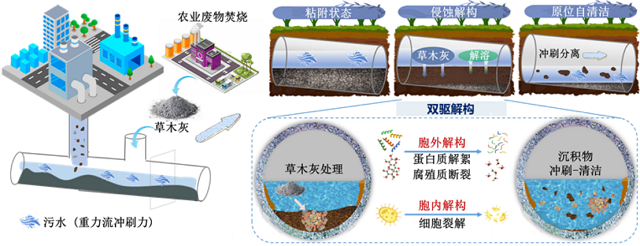 草木灰驅動污水管道沉積物原位自清潔應用場景示意圖