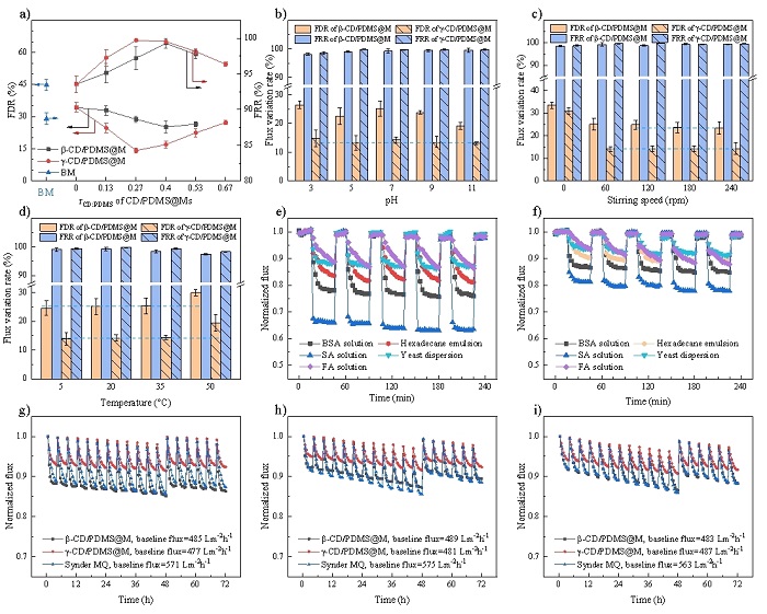 研究成果揭示了CD類型、CD/PDMS摩爾比-CD/PDMS聚輪烷動態性-膜綜合性能間的級聯關系,確定了最佳抗污染層結構。因γ-CD空腔大、柔性強,γ-CD/PDMS聚輪烷的動態性優于β-CD/PDMS聚輪烷。當CD和PDMS鏈節數量比為0.27~0.40時(CD完全覆蓋PDMS時該值為0.67),CD/PDMS聚輪烷動態性最強,此時單個CD動態性和CD數量的乘積最大。實驗結果表明,膜綜合性能在超分子抗污染層動態性最強時達到最高值,20℃下滲透通量500 LMH·bar-1,過濾BSA溶液通量衰減率14.2%,恢復率99.7%,且優秀抗污染效果普適于酵母菌、腐植酸、海藻酸鈉、乳化油等多種污染物,在松花江水、市政污水和魯奇爐煤氣化污水等實際水體的72小時錯流實驗中,也表現出了優越的穩定性,每個反洗周期(4小時)中衰減率僅為3%-7%,化學清洗后通量恢復率接近100%。反證實驗表明了超分子動態性是膜通量提升的關鍵因素,基于AFM的作用力測定和微量吸附實驗進一步證明了超分子動態性在膜抗污染能力強化方面的多重作用。團隊通過實驗和理論的相互驗證,為水處理膜抗污染能力強化提供了更多策略。