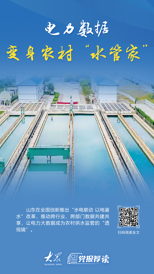 破題 電力大數據成監管“透視鏡” 面對困局,山東以跨界融合思路破題,在全國創新推出“水電聯動以電鑒水”改革,推動跨行業、跨部門數據共建共享,讓電力大數據成為農村供水監管的“透視鏡”。趙琳介紹,省水利廳與國家電網山東省電力公司近日聯合印發的《關于開展“水電協同以電鑒水”專項行動賦能農村供水保障與鄉村治理現代化的通知》,標志著這一改革正式落地。